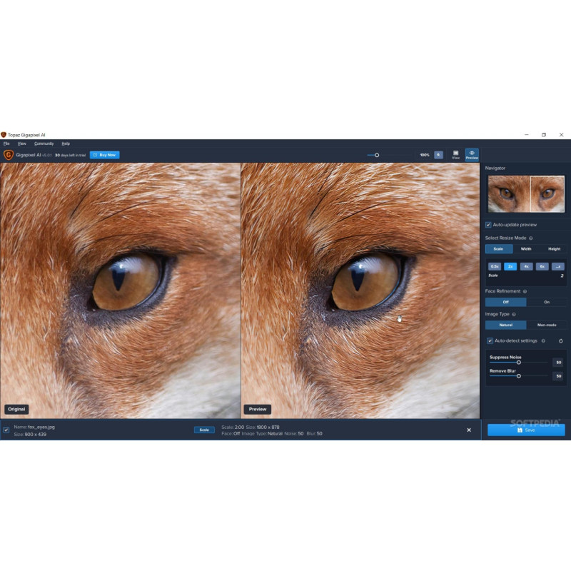 Topaz A.I. Gigapixel - це перша і єдина програма, що використовує силу штучного інтелекту для збільшення ваших зображень, додаючи природні деталі для дивовижного результату. Використовуючи технологію глибокого навчання, A.I.Gigapixel ™ може збільшити зображення та заповнити деталі, які інші продукти зміни розмірів не враховуються.