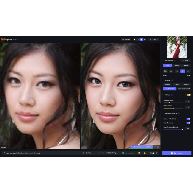 Хоча Gigapixel AI найкраще працює з вихідними зображеннями середньої чи високої якості, він також може творити дива з надзвичайно низькою якістю та стислими зображеннями. На додаток до збільшення дозволу модель Very Compressed також автоматично видаляє артефакти стиснення JPEG, застосовує шумозаглушення і підвищує різкість виведення природним чином.